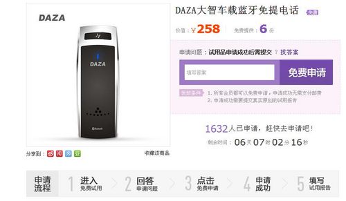 用戶免費(fèi)拿車載藍(lán)牙免提的方式十分簡(jiǎn)單,大家只需在5月27日至6月2日期間,前往天貓商城的大智官方(微博:http://e.weibo.com/szdaza)網(wǎng)店,找到B164這款寶貝,動(dòng)動(dòng)鼠標(biāo),回答問(wèn)題之后提交產(chǎn)品試用申請(qǐng),隨后就有可能得到由大智送出的車載藍(lán)牙免提B164一臺(tái)。