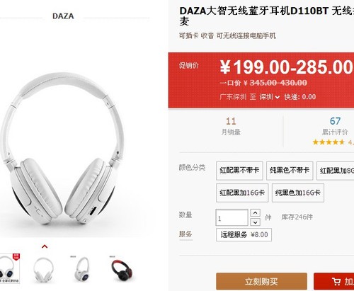 小編繼續(xù)觀察了店鋪里的一款型號為D110BT藍牙+插卡多功能的高端耳機產(chǎn)品,出人意料的是,這款平時賣400~500元以上的奢華無線耳機現(xiàn)在居然僅售199元,促銷力度可謂全年僅此一次了。