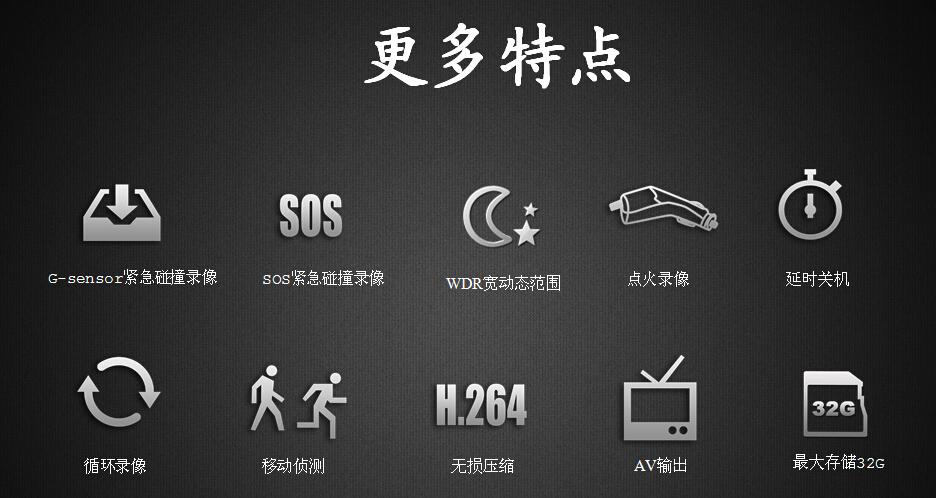另外,大智G320極清行車記錄儀還擁有必備的諸多實用功能,如點火自動錄像、延遲關(guān)機、G-Sensor重力感應(yīng)、碰撞/SOS緊急錄像、鎖定重要錄像、移動偵測、循環(huán)錄像、H.264無損壓縮等等。
