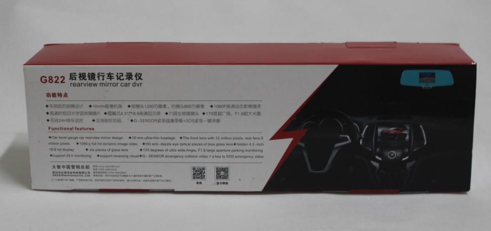 在包裝盒背面是G822后視鏡雙鏡頭行車記錄儀詳細的功能特點介紹(中英文對照),當然大智詳細的聯(lián)系方式也在下面,還有官網(wǎng)地址和微信的二維碼,以便各位車友能及時與大智中國總部取得聯(lián)系。
