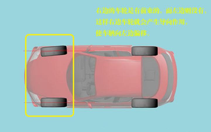前輪前束相差角度過大同樣會引起跑偏,且肉眼不易察覺。它所引起的跑偏通常伴隨輪胎偏磨的現(xiàn)象也就是我們常說的啃胎。
