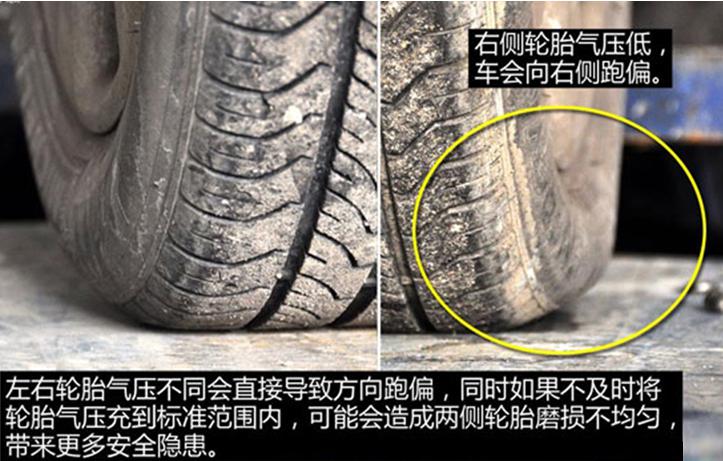 輪胎胎壓相差較多時會使左右兩側(cè)輪胎半徑不一樣。在相同的輪胎轉(zhuǎn)速下胎壓高的一側(cè)行駛里程會比胎壓低的一側(cè)行駛里程更長。由于兩個車輪基本處于剛性連接狀態(tài),所以車輛會自動向胎壓較低的一側(cè)車輪跑偏。
