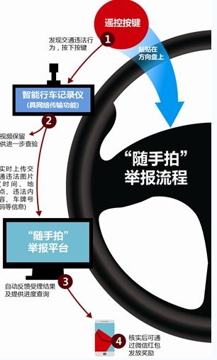 記者獲悉,市民只要安裝了智能行車(chē)記錄儀,發(fā)現(xiàn)道路上的交通違法行為后,只需按下設(shè)置在方向盤(pán)上的按鍵,就能將交通安全違法行為發(fā)生的時(shí)間、地點(diǎn)、違法內(nèi)容、車(chē)牌號(hào)碼以及能記錄機(jī)動(dòng)車(chē)發(fā)生道路交通安全違法行為完整過(guò)程的圖片或視頻等信息,實(shí)時(shí)上傳至“隨手拍舉報(bào)平臺(tái)”。