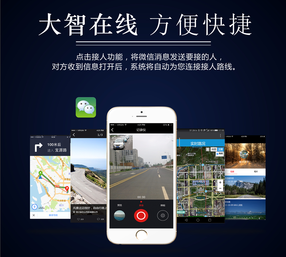 大智在線微信互聯(lián)技術(shù),完美的實現(xiàn)了手機與后視鏡的互聯(lián)!徹底跨越了時間和空間的限制,足以顛覆我們對行車記錄儀的理解和使用習(xí)慣。車主只需關(guān)注微信公眾號“大智在線”,便可以加持遠程操控和實時定位等實用功能。從此便可以隨時通過微信端的簡單操作,實現(xiàn)24小時遠程實時視頻直播,拍照、分享、查看歷史軌跡、對設(shè)備進行消息和位置推送等功能,暢享前所未有的移動車聯(lián)網(wǎng)體驗。