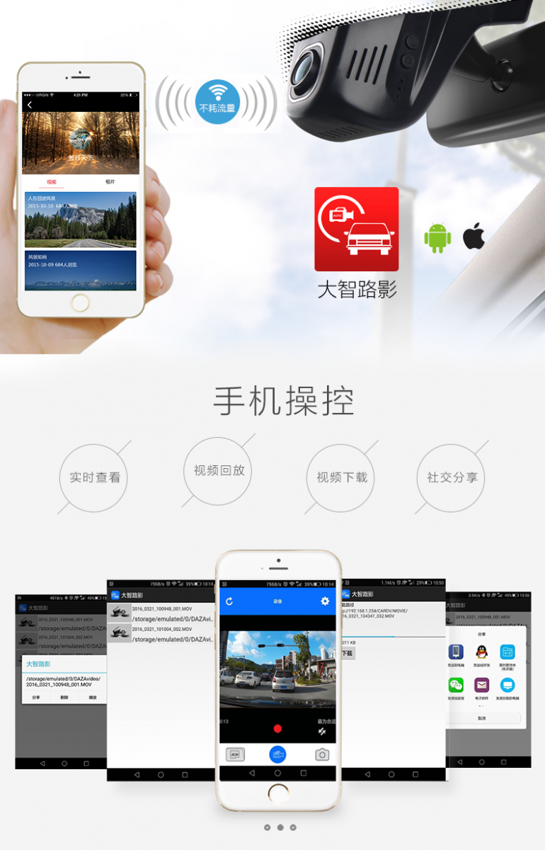 大智專車專用行車記錄儀采用手機(jī)WIFI連接,APP操控。在手機(jī)上安裝大智路影APP后,通過WIFI連接機(jī)器,即可隨時(shí)用手機(jī)實(shí)時(shí)查看和回放視頻,也可以通過APP直接下載視頻和圖片到手機(jī)上,通過微信和微博等社交工具和親人朋友分享旅途中的快樂和趣事。
