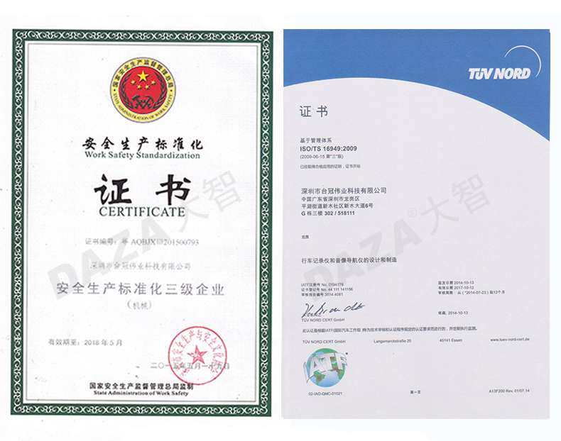 大智非常重視產(chǎn)品的品質(zhì),早在2014年大智就獲得了國(guó)際汽車行業(yè)的技術(shù)規(guī)范TS16949的認(rèn)證(編碼:NO44111141156),此認(rèn)證只有汽車整車廠和其直接的零部件制造商才有資格獲得,并且認(rèn)證廠家必須與汽車生產(chǎn)有關(guān),大智是目前行業(yè)獲得此認(rèn)證屈指可數(shù)的品牌之一。關(guān)于售后大智也是國(guó)內(nèi)首家敢提出,專車專用行車記錄儀2年或10萬(wàn)公里包換的品牌。