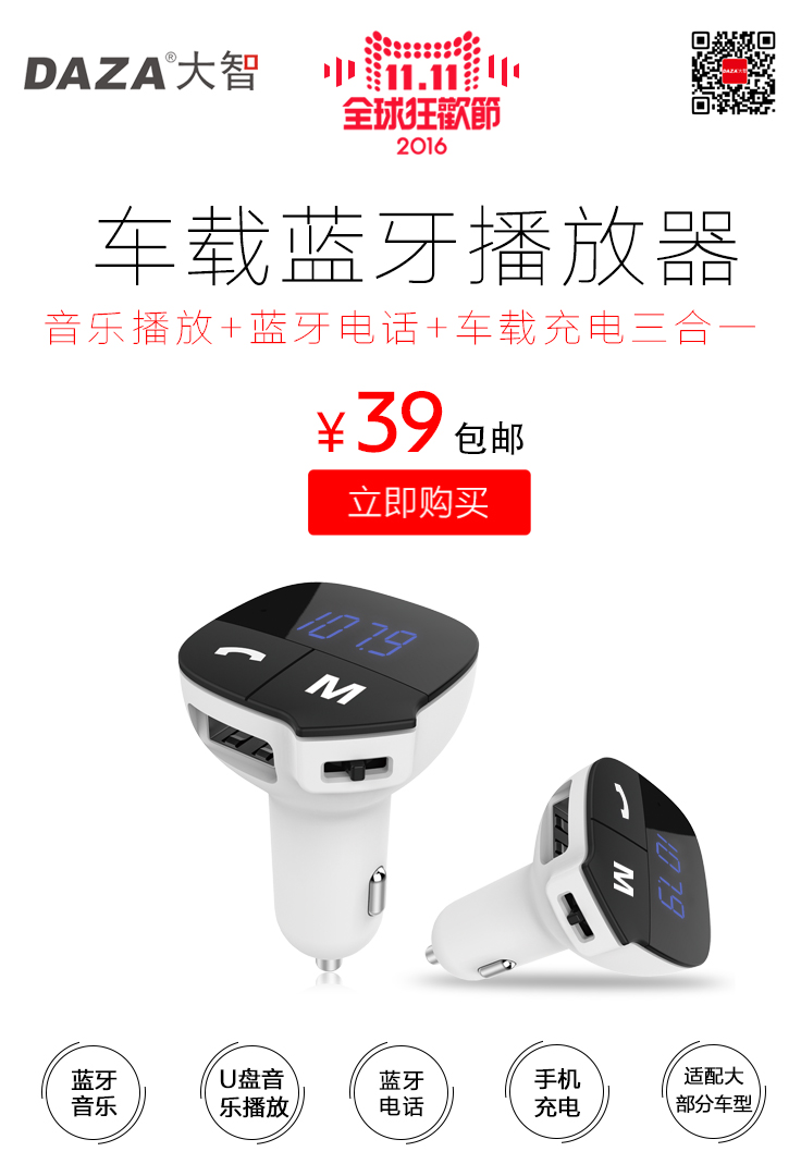雙十一馬上就要到了,大智藍(lán)牙車充F219在雙十一當(dāng)天在大智天貓商城僅售39元(包郵),如果你喜歡這款車載充電器那就抓住機(jī)會(huì),該出手時(shí)就出手吧!