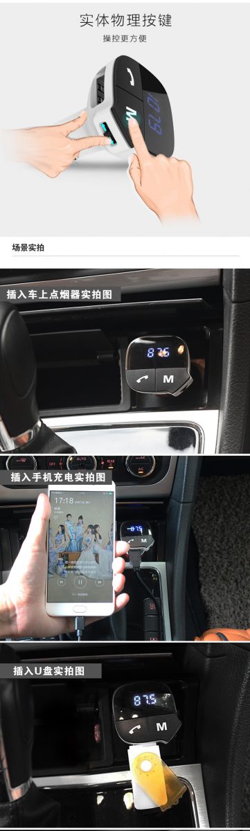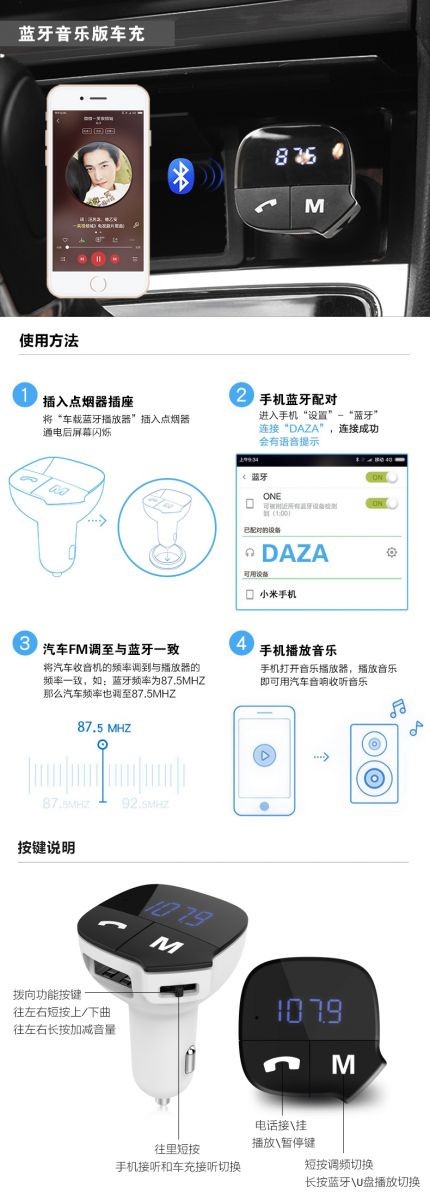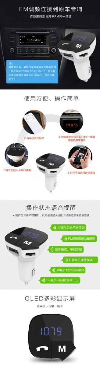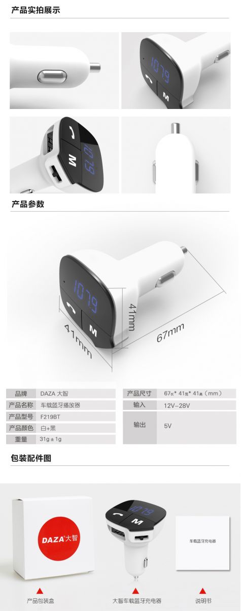 大智車載藍(lán)牙車充F219是一款所有車主都用的上車載充電器,它把藍(lán)牙電話/音樂、音樂播放器、車載充電器三個(gè)實(shí)用的功能合為一體,讓車主駕駛時(shí)安心開車,避免分心。下面這幾張圖,讓你一分鐘了解大智車載藍(lán)牙充電器F219。